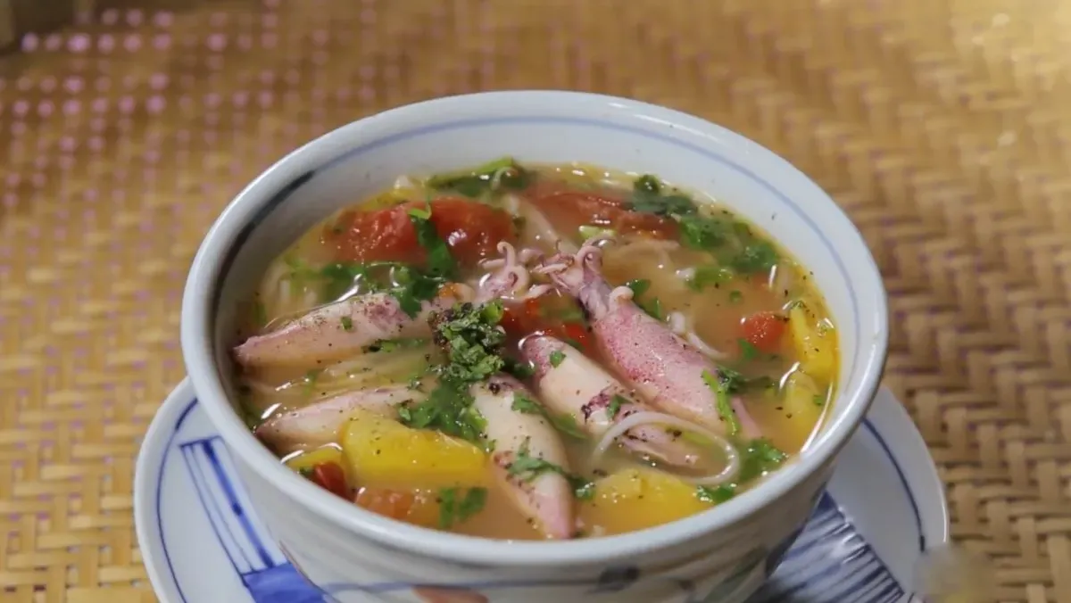 Một tô bún mực bốc khói nghi ngút, điểm xuyết màu đỏ của cà chua, màu vàng của dứa và màu xanh của hành ngò trông vô cùng bắt mắt. Vị chua thanh thoát của món ăn này cực kỳ hợp với những ngày nắng gió miền Trung, giúp bạn giải nhiệt và cảm thấy nhẹ nhàng hơn sau những bữa tiệc hải sản thịnh soạn. Chỉ cần thêm một chút ớt băm và rau sống, bún mực Tuy Hòa chắc chắn sẽ khiến bạn phải húp đến giọt nước cuối cùng.